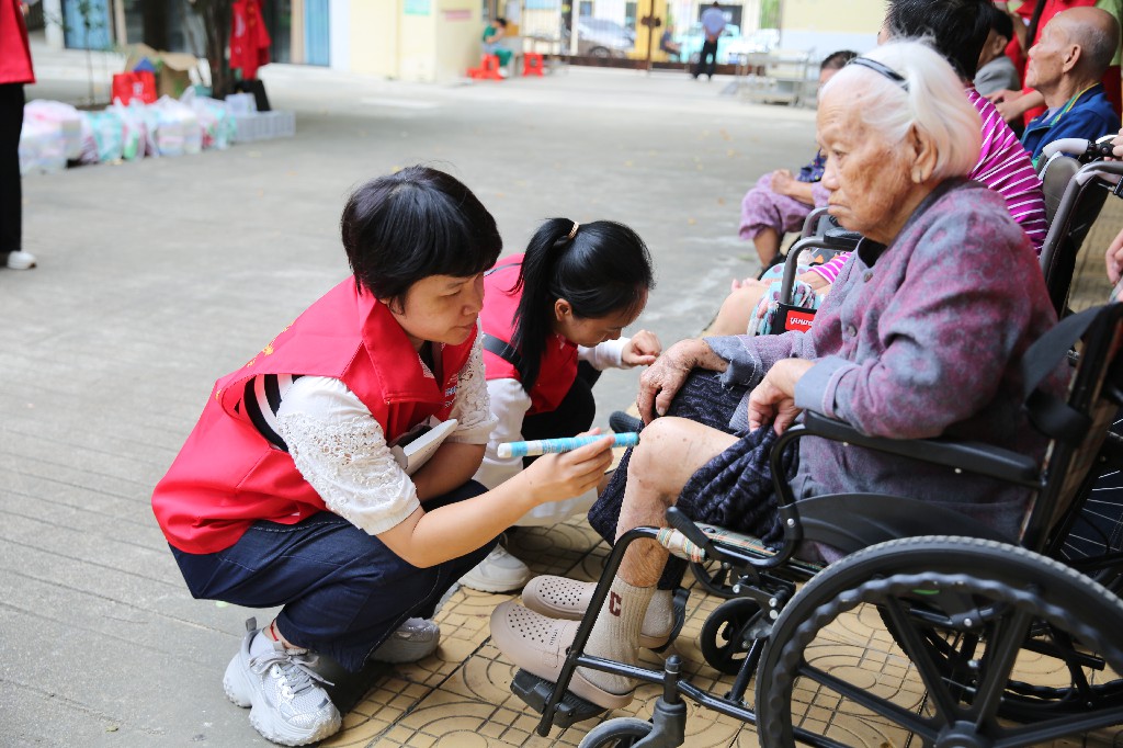 依托我校医药卫生专业优势,志愿者们分组为老人开展健康服务。他们熟练地为老人测量血压,针对关节疼痛等常见问题适时提供艾灸和推拿按摩服务,并耐心讲解饮食调理、防跌倒等实用保健知识。志愿者们专业、贴心的服务赢得了老人们一致好评,一张张笑脸,一声声“谢谢”,成为这个重阳节最美的回响。