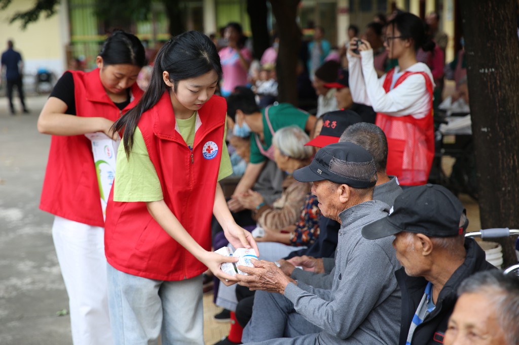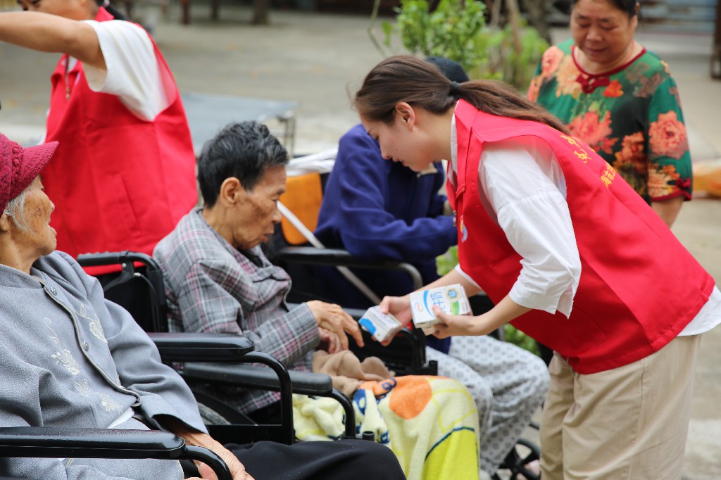 活动尾声,志愿者为老人们送上了牛奶、纸巾等实用的慰问品,并致以诚挚的节日问候。礼物虽轻,却承载着师生们对长辈的牵挂与敬意。一句句温暖的祝福,一声声贴心的叮咛,让老人们脸上洋溢着幸福的笑容。有的老人紧紧握住志愿者的手久久不愿松开,连声道谢,现场温情涌动,暖意融融。