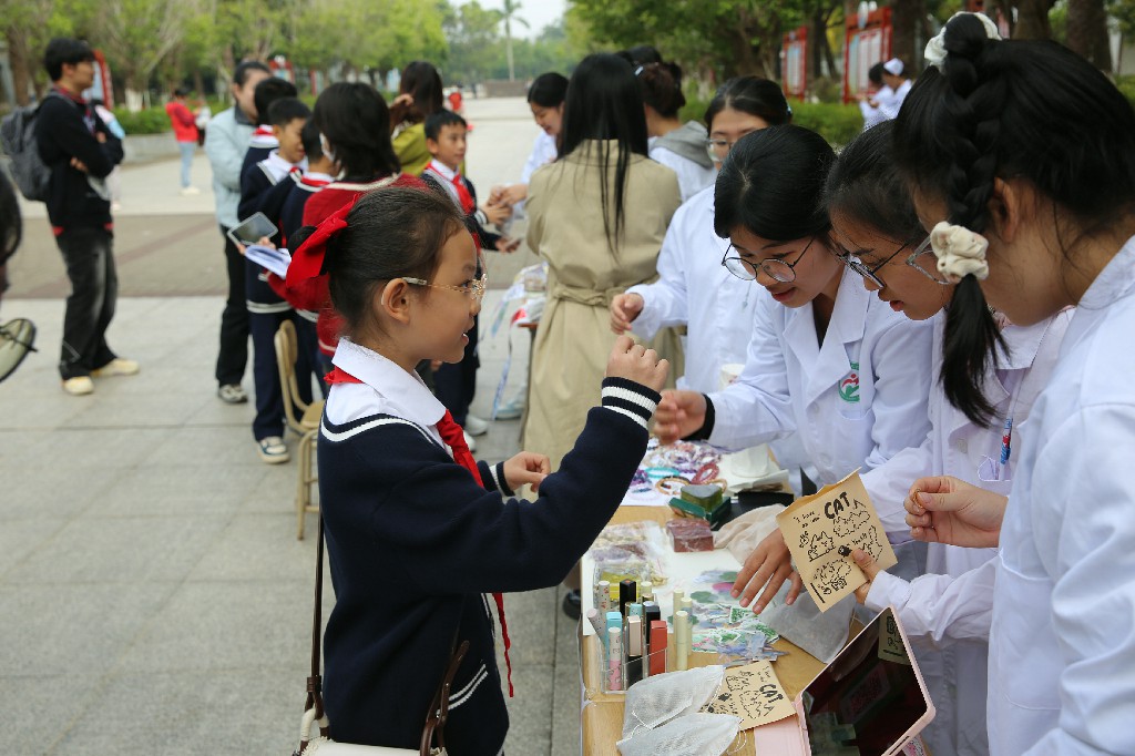 为推动中医药文化在青少年群体中普及传播,增强小学生对中华优秀传统文化的认同感与自豪感,我校与北海市海城区第二实验小学(以下简称“二实验”)合作开展中医药文化进校园结对共建活动。近日,该校组织师生赴我校开展研学活动,在沉浸式体验中感受中医药文化的独特魅力。