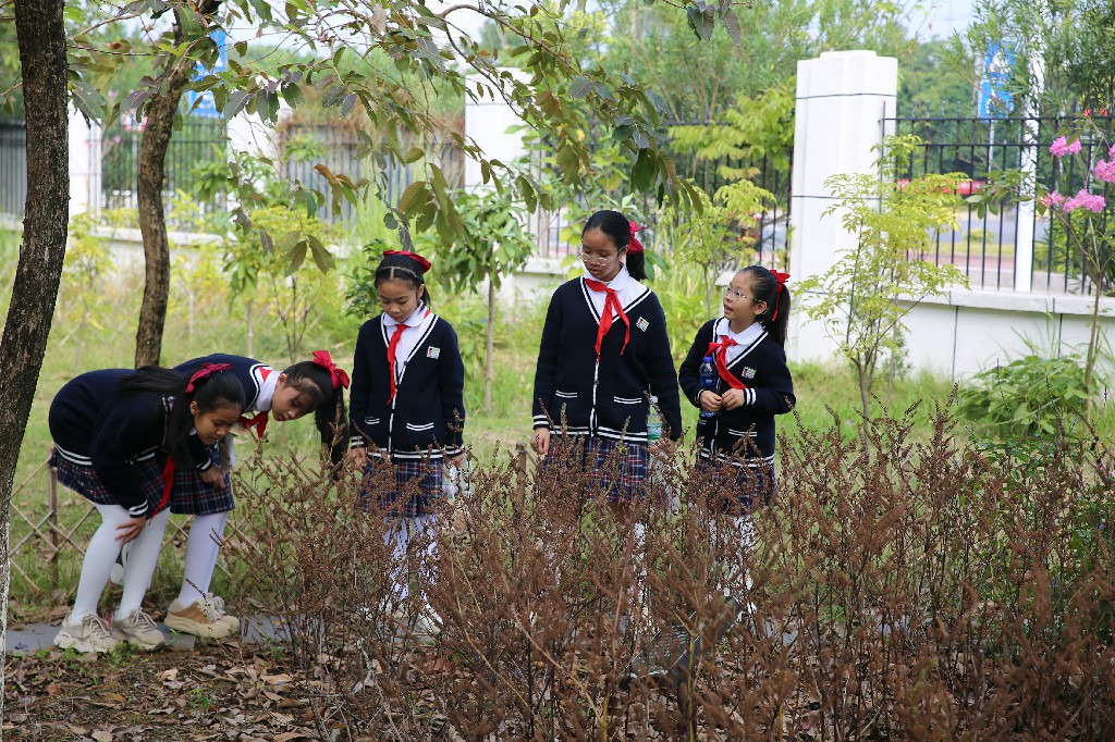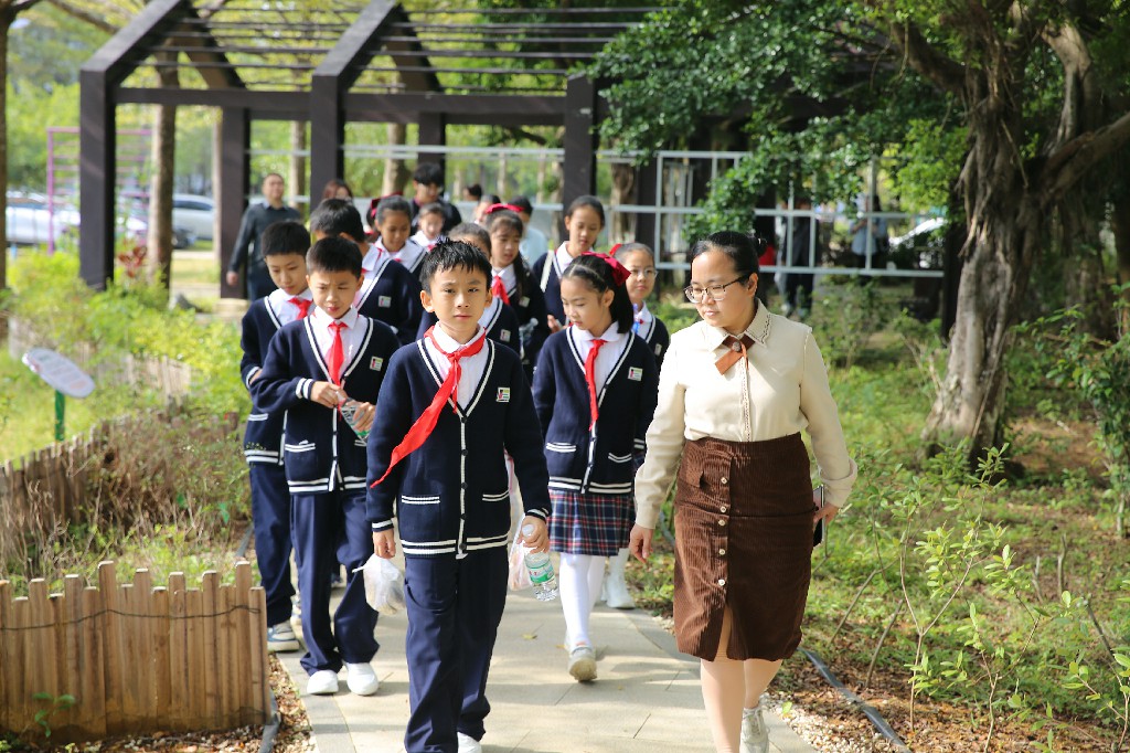 随后,师生们走进600平方米的药用植物园,在江南园林风格的景致中开启“植物探秘”。解说员重点介绍了肾菜、金银花、广藿香、芦荟等特色药用植物,讲解了它们的形态特征、药用功效及生活应用——如可食用且护肾的肾菜、能清热降火的金银花、驱蚊解表的广藿香及清热泻火的芦荟等。师生们沿着石板路前行,参观了张仲景雕塑、24节气凉亭、华佗雕塑和阴阳广场等景观节点,了解了中医药节气养生的传统智慧与“阴阳平衡”的核心哲理,在绿意盎然的园子里感受“棵棵是草药,株株能治病”的自然奥秘。